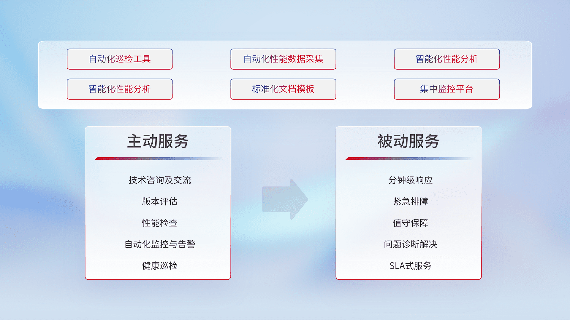 智能化工具和标准化文档,,保障服务质量,,,,提供主动服务(包含技术咨询、、、、版本评估、、、、性能检查、、、自动化监控与告警、、、、健康巡检)和被动服务包含(分钟级响应、、、紧急排障、、、值守保障、、、问题诊断解决、、SLA服务)。。